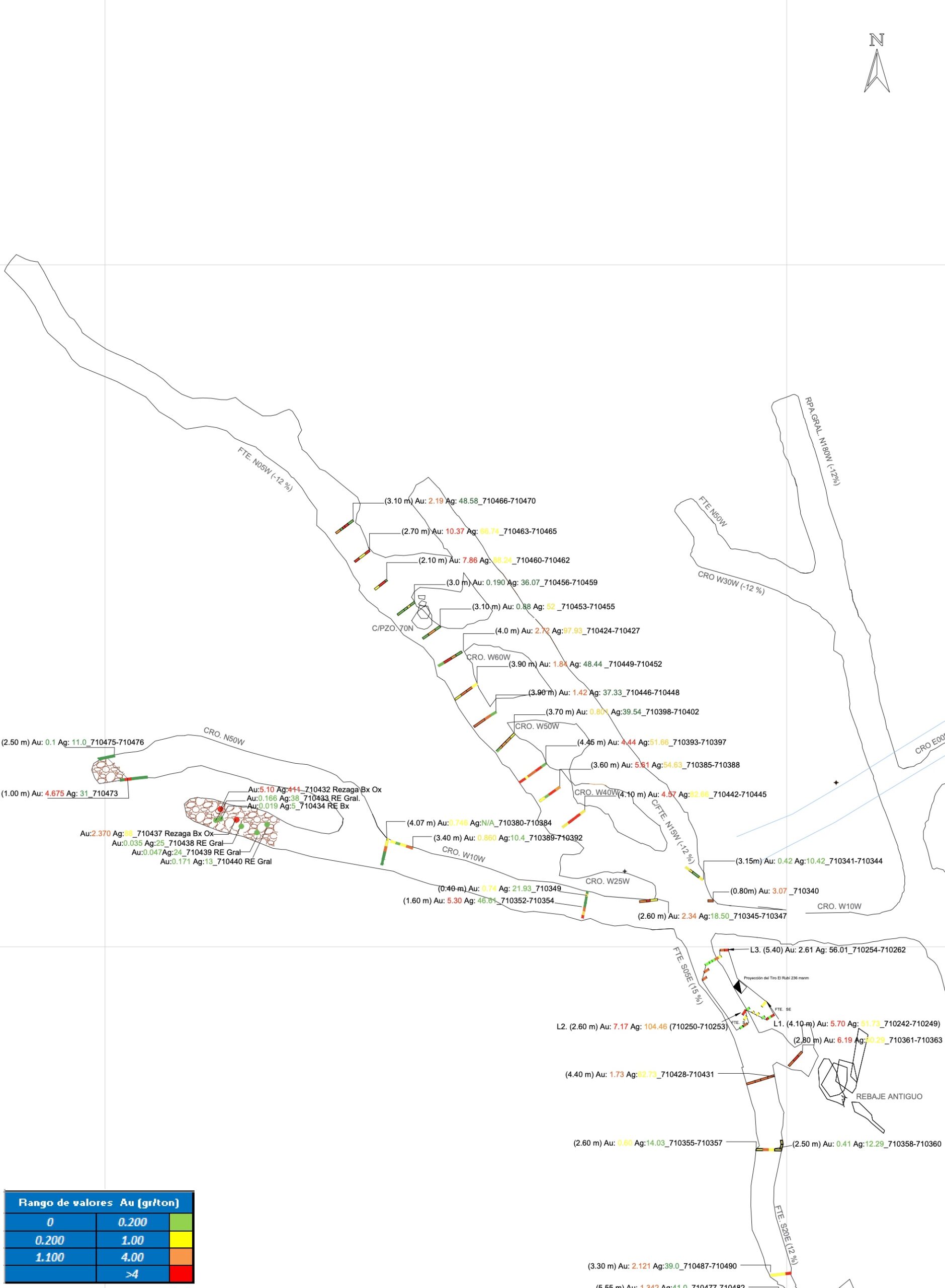 El Rubi – 55.6 g/t Au, 150 g/t Ag, 655 g/t Cu, 1505 g/t Pb, 4,330 g/t Zn over 0.6 meters.